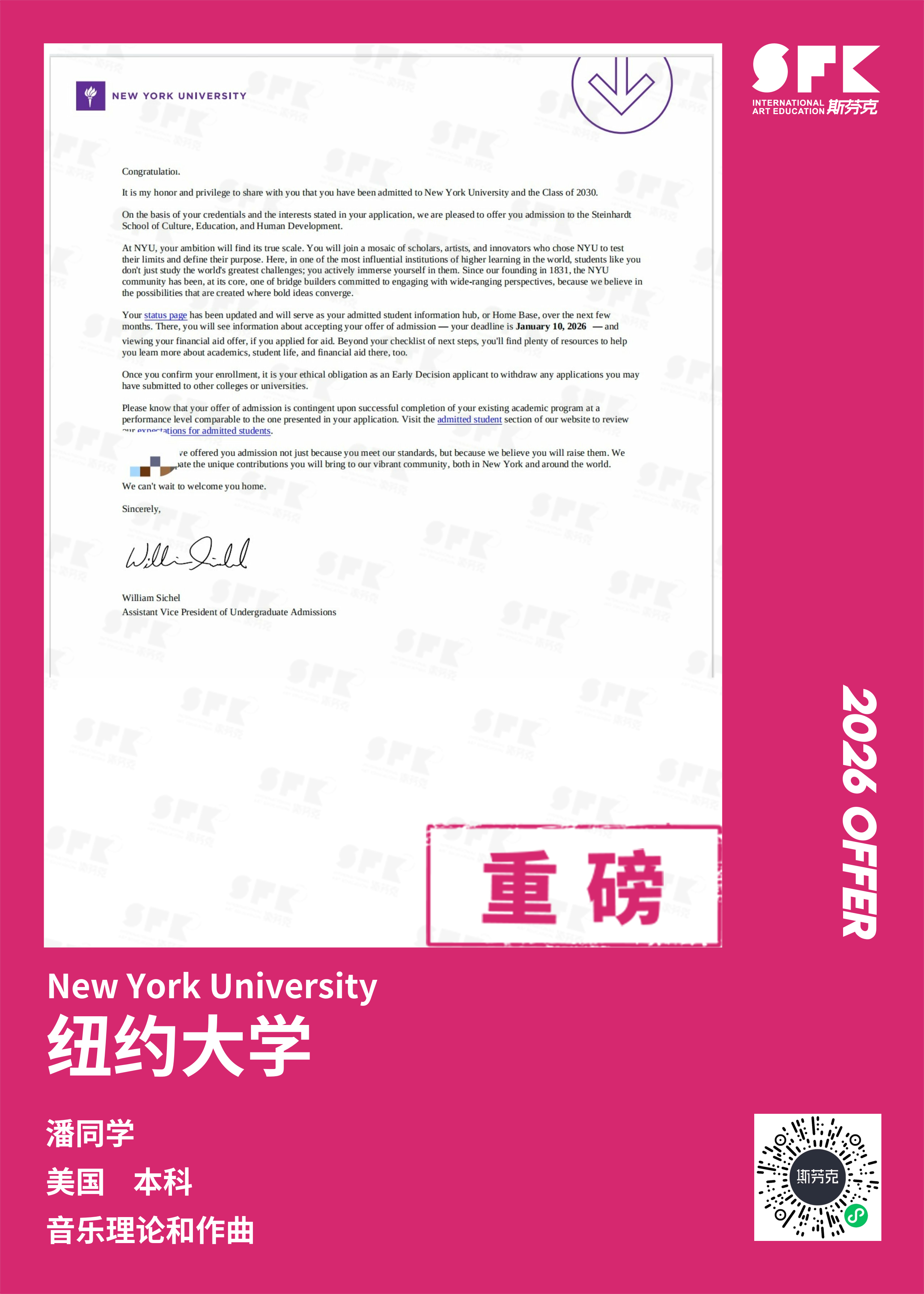 斩获约翰霍普金斯大学、耶鲁大学、西北大学、纽约大学等综合大U音乐学院Offer